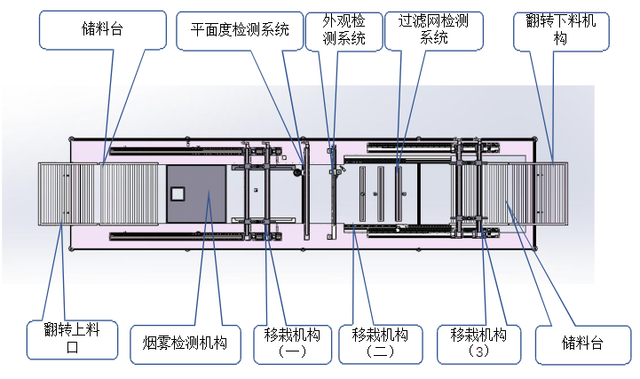移栽機構(二):采用模組根據產品調節寬距,利用模組將產品移動平面、四周瑕疵、過濾網瑕疵工位檢測。